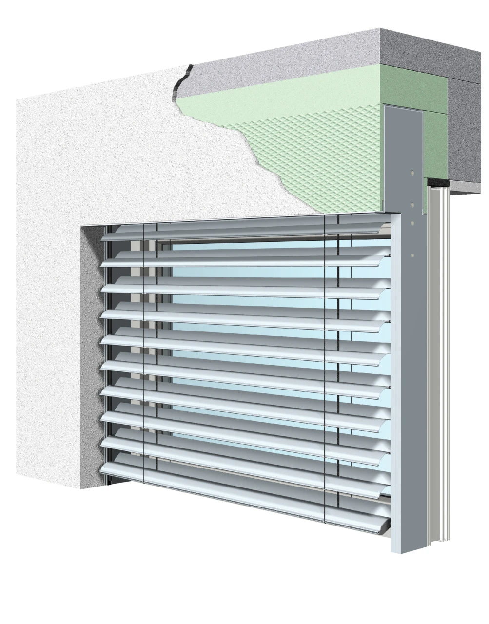 Fenster-System-Außenjalousien lassen sich unauffällig oder als sichtbares Element in die Fassade integrieren. Da sich die Anlagen nahtlos in Wärmedämmverbundsysteme (WDVS) einfügen, erfüllen diese Außenjalousien problemlos die kontinuierlich steigenden Wärmeschutzanforderungen. Neben klassischen Führungsprofilen sind auch Fenster-System-Außenjalousien mit filigraner Seilführung der einer Seil-/Schienenkombination ähnelt möglich.